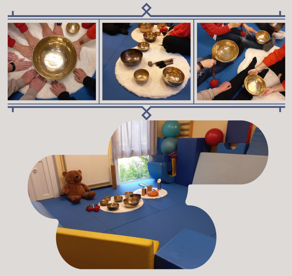 Deux groupes d’enfants de l’hôpital de Jour Petite Enfance – Enfance suivis tout au long de l’année sur un groupe psychomoteur encadrés par une psychomotricienne, deux infirmières et deux monitrices-éducatrices ont pu bénéficier grâce à l’ASPIC de trois séances de découverte de la sonothérapie en avril-mai 2025 avec Audrey, une professionnelle extérieure.